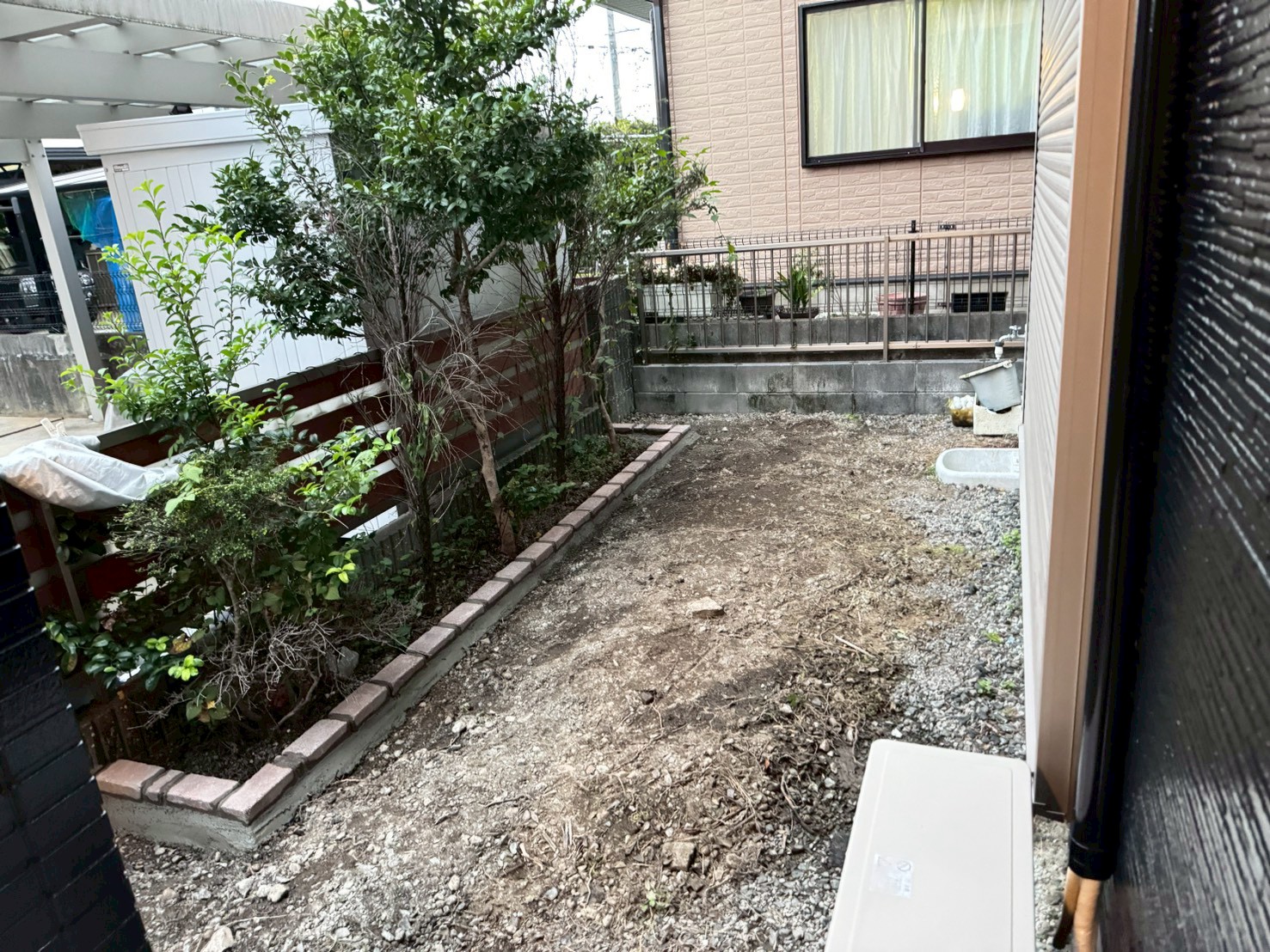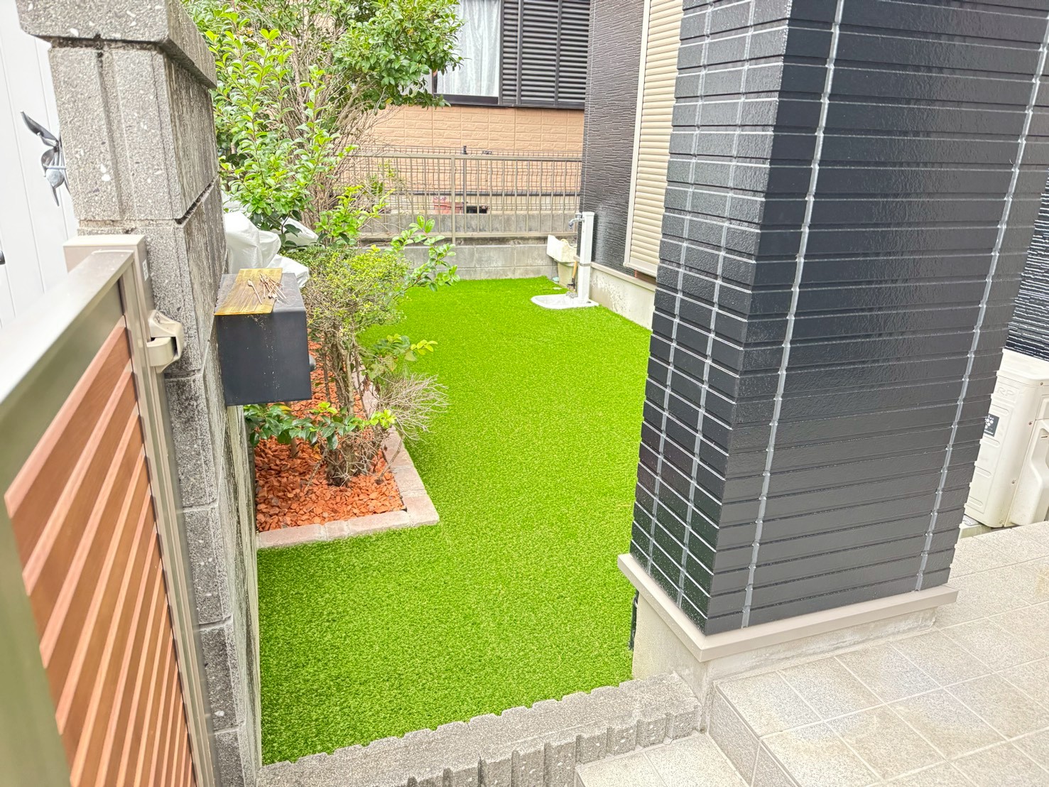 今回は、お庭まわりの見直しとして、人工芝とスリットレンガ、そしてレンガチップを組み合わせた外構工事を行いました。